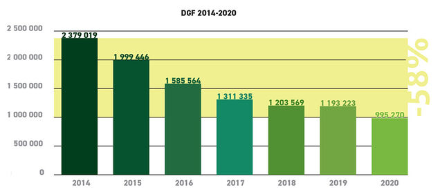 La Dotation Globale de Fonctionnement (DGF) est passée de 2 379 019 € en 2014 à 995 270 € en 2020 soit une baisse de 58 %.